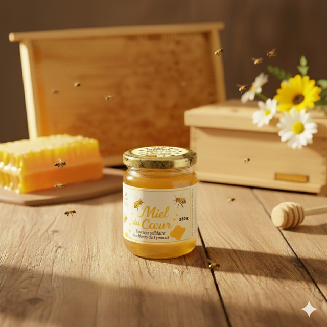 Découvrez LE MIEL DU CŒUR, un trésor doré venu tout droit des Monts du Lyonnais, récolté avec amour et respect de la nature 💛🐝.